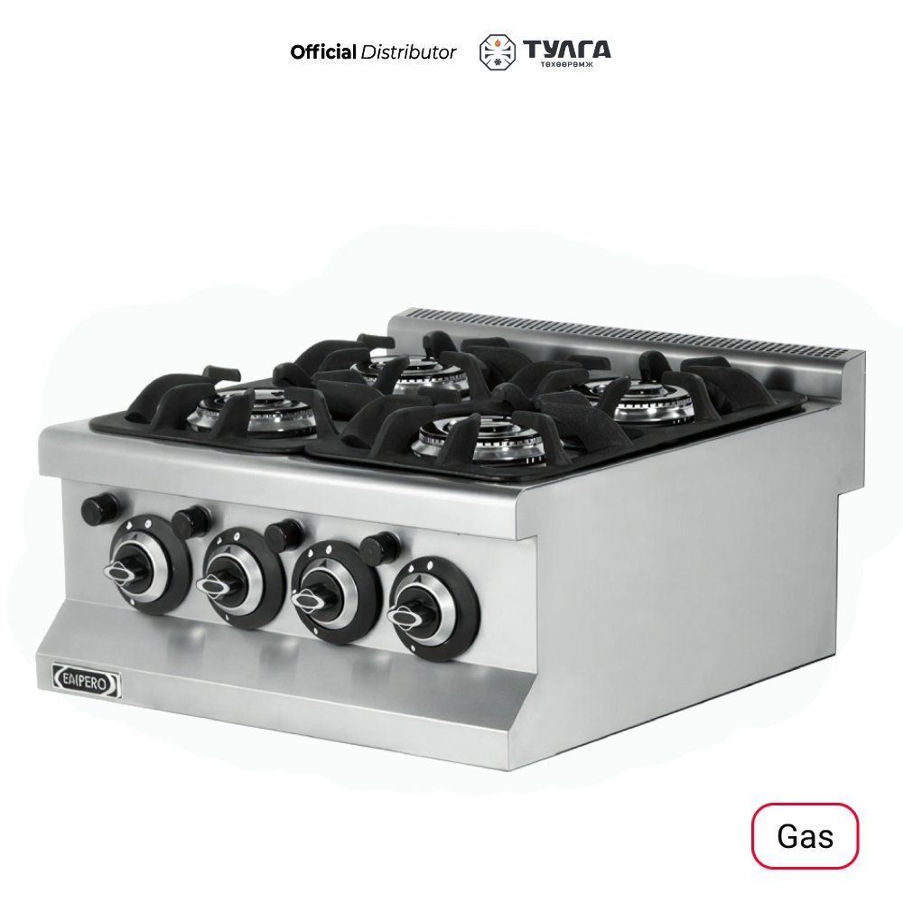 EMPERO EMP.6KG020-O нь мэргэжлийн зориулалттай, ширээн дээр байрлуулж ашиглах боломжтой 4 ширэмтэй хийн плитка юм. Туркийн Empero брэндийн энэхүү загвар нь өндөр дулааны хүчин чадалтай, бат бөх ган бүтэцтэй бөгөөд ресторан болон нийтийн хоолны газар өдөр тутмын эрчимтэй хэрэглээнд бүрэн тохирно.